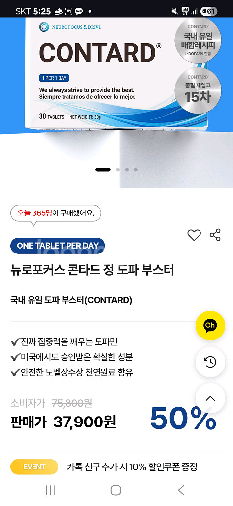 정도파 부스터 제품이에요. 국내 유일 도파 부스터로 일일 한 알씩 드시면 좋다고 하네요. 건강 관리하시는 분께 추천드려요! 정가37900원 배송비별도3000원인데 15000원에드리께여