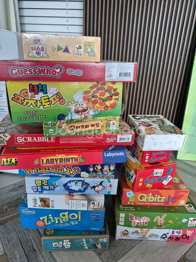 CU 반값 편의점 택배 가능 (선불 2천원. 서로 추가금액 안 받아요) 3개이상은 제가 부담하며, CU 반값 편의점 택배로 보내드립니다. 5개 구매시 일반 택배로 집까지 보내드립니다. 대부분 필수 구성품 다 있고, 상태 괜찮습니다. 놀이하는데도 전혀 문제가 없는 것들이에요. 당근 마켓에도 함께 판매하고 있어서 입금 순으로 먼저 판매하겠습니다 징고 Zingo!→ 판매완료 큐비츠 주니어 Q-bitz Jr.→ 판매완료 주니어 라비린스 Labyrinth → 20,000원 저스트원 → 18,000원 (미개봉) 할리갈리 컵스 → 5,000원 (겉상자 중국어) 흔들흔들 피자토핑 → 7,000원 펭귄 얼음 깨기 → 2,000원 스크래블 보드게임 SCRABBLE → 8,000원 폴드 잇 Fold It → (판매완료) 게스 후 Guess Who? → 10,000원 동물 메모리 게임→ 판매완료 What am I? → 5,000원 라온 → 판매완료 토끼는 당근을 좋아해 → 9,000원 즐거운 숫자놀이 → 5,000원 큐비즈(행복한 바오밥) → 9,000원 빨간모자 퍼즐게임→ 9,000원 (상자없음) 스피드원반퍼즐게임 PUCK PUZZLE → 9,000원 (상자없음) 사진이 최대 10개만 올릴 수 있어서 ☆구매 의사가 있으신 분☆께는 상세사진 보내드릴 수 있어요 찔러보기 사절