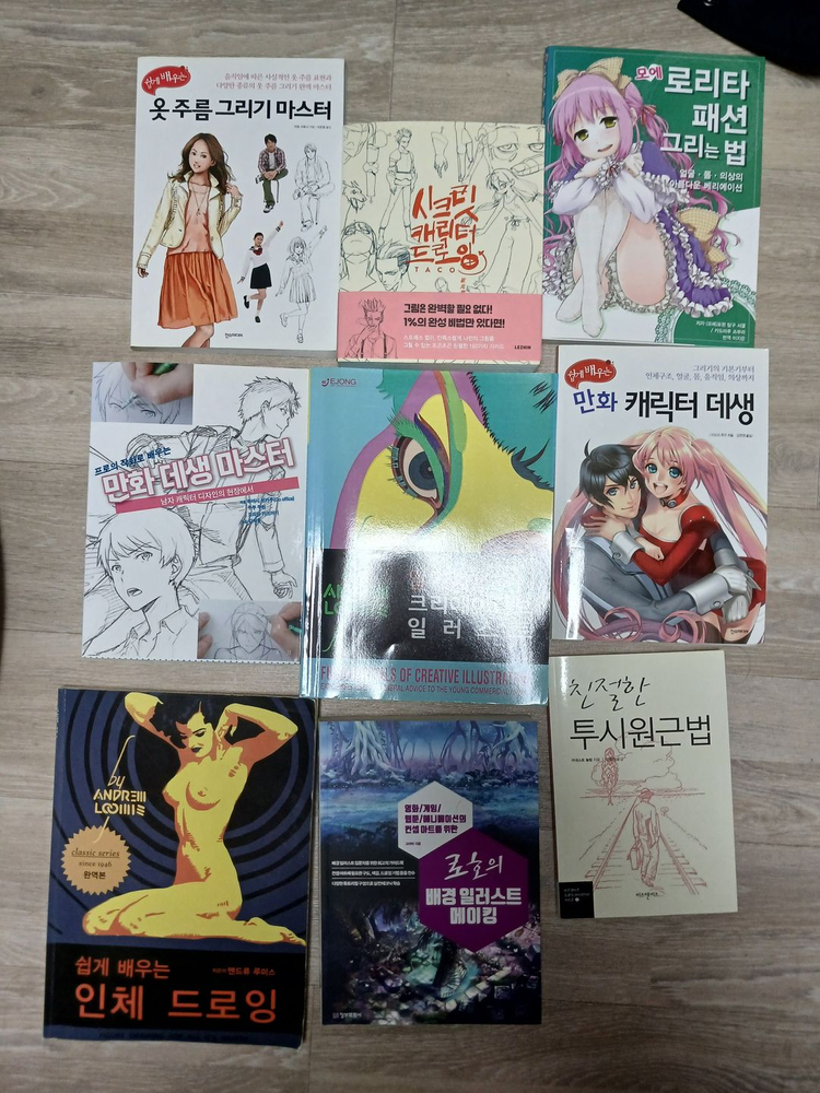 있는거만 새로 작성해서 올려요 책에 낙서하는거 싫어해서 대부분 표지빼곤 새책 같아요 자세한 상태 원하시면 내부 몇장 사진 찍어서 보내드릴 수 있습니다 X있는건 판매완료입니다 앤드류 루미스의 인체 드로잉 9000원 만화 데생 마스터 7000원 x 옷 주름 그리기 마스터 5000원 만화 캐릭터 데생 5000원 펜 스케치 7000원 x 로리타 패션 그리는 법 8000원 알기 쉬운 크리에이티브 일러스트 10000원 로호의 배경 일러스트 메이킹 13000원 앤드류 루미스의 두상과 손 드로잉 5000원 이준구 저 쉽게 배우는 인체드로잉 9000원 x 오른쪽 두뇌로 그림그리기 10000원 컬러 앤 라이트 15000원 시크릿 캐릭터 드로잉 8000원 x 친절한 투시원근법 6000원 x 친절한 드로잉 8000원 만화로 배우는 투시원근법 7000원 애니메이터가 가르쳐주는 캐릭터 그리기의 기본 법칙 7000원 x 최고의 그림을 그리는 방법 7000원 x 석가의 해부학 (3등분 철 돼있어요) 30000원 오른쪽 두뇌로 그림그리기 10000원 만화가를 위한 익스트림 투시원근법 9000원 x 그림은 금방 능숙해지지 않는다 7000원 x 프로의 작화로 배우는 여자 캐릭터 작화 마스터 9000원 x 죠셉 셰퍼드 저 누드 드로잉 1 6000원