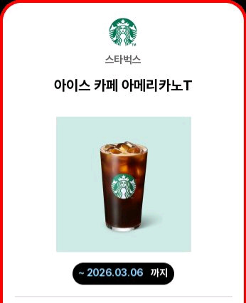 스타벅스 아이스아메리카노입니다. 유효기간은 3월6일까지 입니다.