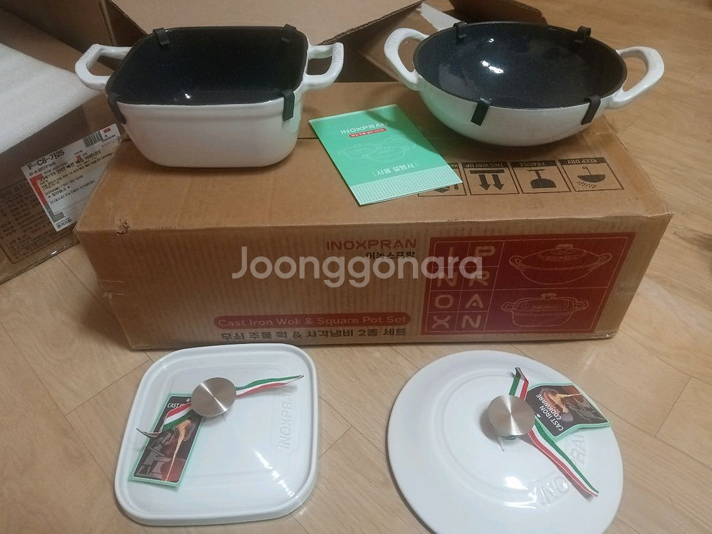 새 제품 상품 확인후 실사 사진만 찍고 바로 판매 합니다. 이녹스 프랑 무쇠 주물냄비 2종 입니다. 웍 냄비 21cm와 사각 냄비 17cm로 구성 되어 있습니다. 설명서 보시고 잘 사용 하세요. 24시간 아무때나 채팅 주세요. 답변이 늦더라도 확인 되면 연락 드려요. 기달려 주세요. 주소지 전송시 대화창 옆에 + 누르시면 주소지 전송 버튼 나와요. 그거 누르시면 됩니다. 그냥 보내시면 주소보이지 않게 나와요. 참고 바랍니다.