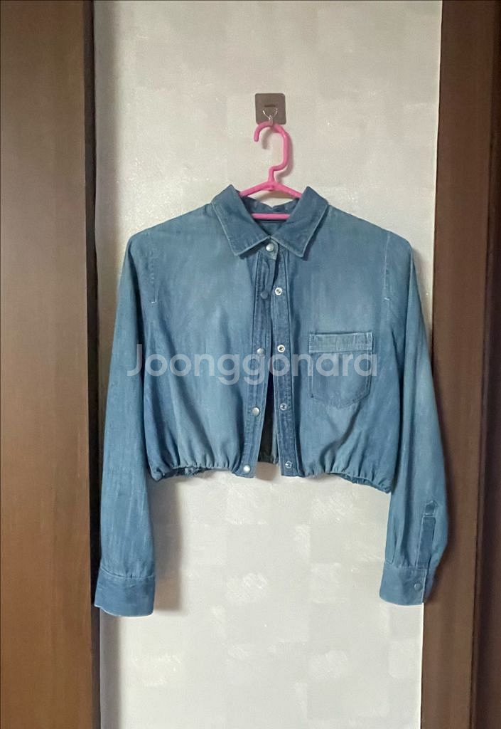 라이트 블루 컬러의 데님 크롭 셔츠예요. 앞면은 단색 데님이고 뒷면에 화이트 패턴 디테일이 있어서 포인트가 되는 아이템입니다. 상태 양호하고 깔끔하게 관리되었어요. 90입으시는분추천