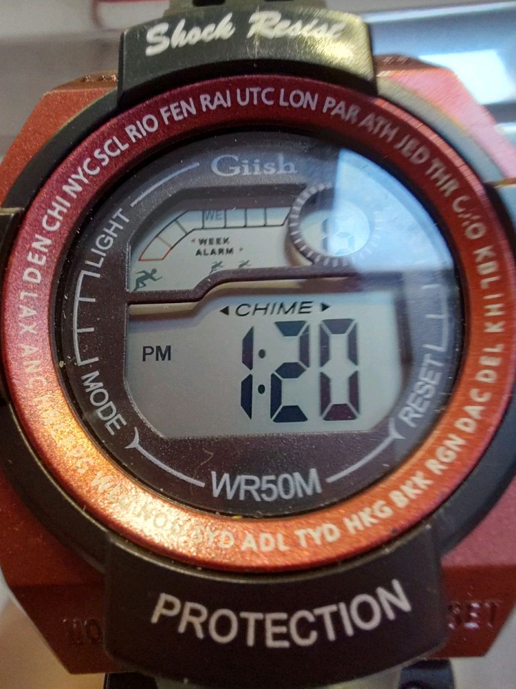 디지털 시계예요. 방수 기능과 충격 저항 기능이 있어서 실용적이고, 디스플레이도 깨끗하게 잘 작동해요. 빈티지한 느낌의 멋진 디자인이 매력적인 제품입니다.