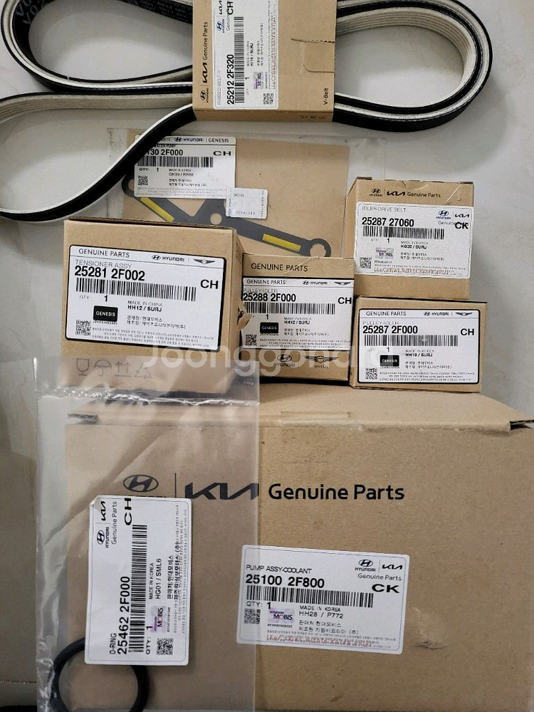 ■R엔진 외부벨트 풀셋입니다(※댐퍼풀리 포함) ■적용차종 싼타페 DM/UM쏘렌토/쏘렌토R/스포티지알/QL기타R엔진 디젤엔진오일차량 ■구성품 1.외벨트(25212-2F320) 2.워터펌프(25100-2F800) 3.가스켓(25130-2F000) 4.오링(25462-2F000) 5.텐션베어링(25281-2F002) 6.풀리 아이들(25287-2F000) 7.풀리 아이들(25288-2F000) 8.풀리 아이들(2587-27060) 9.댐퍼풀리(23124-2F602) ※외부 벨트 교환시는 외부 벨트와 같이 구동되는 아이들 베어링.텐션 베어링.워터 펌프등 같이 교환을 해야 나중에 이중 비용을 줄일수 있습니다. ₩18만 5천 택포(부품대리점 정상가21만~ 구매는 안전결제 진행하심됩니다 네고문의는 받지않습니다