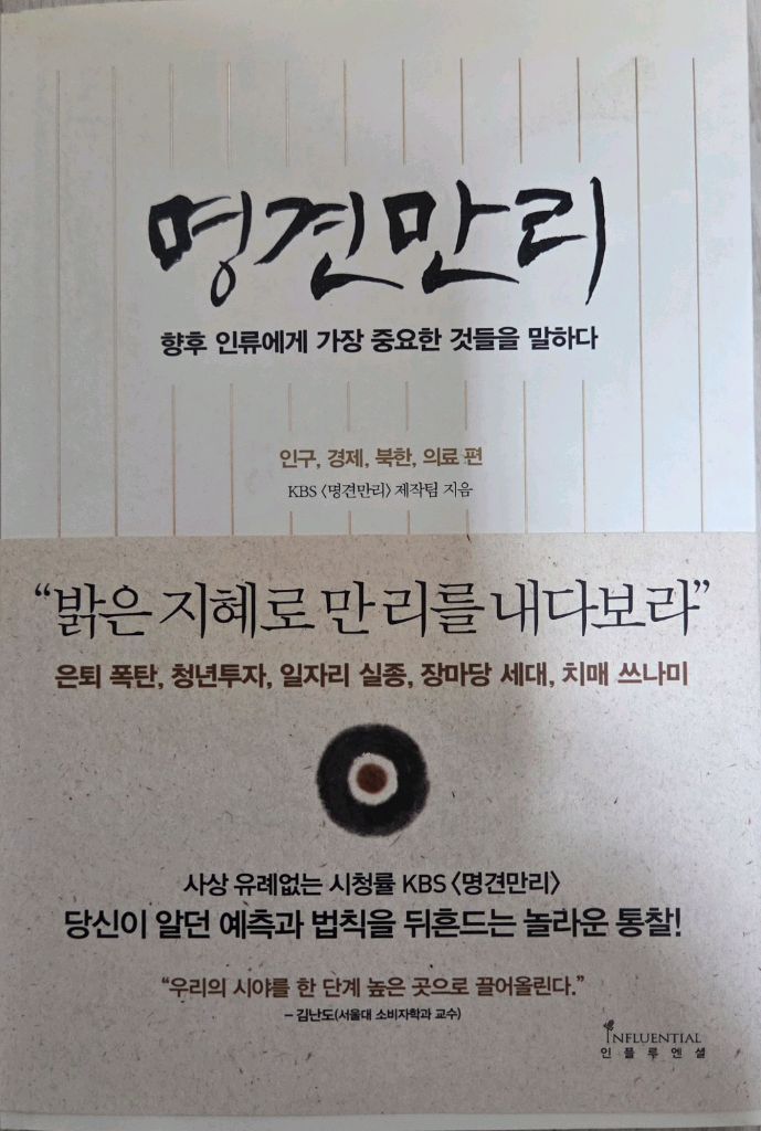 주요 내용: 인구 변화, 일자리 소멸, 유전자 혁명, 새로운 소비 형태 등 인류에게 중요한 미래 지식을 다룹니다. 특징: 각종 트렌드, 사례, 데이터를 통해 현재의 변화와 미래의 기회를 포착하며, '문제'보다는 잠재된 '기회'에 주목합니다. 형식: KBS에서 방영된 렉처멘터리(강연+다큐멘터리) 프로그램을 책으로 엮은 것입니다. 저자 및 출판사: KBS 명견만리 제작팀 지음, 인플루엔셜 출판. 평가: 기존의 예측과 법칙을 뒤흔드는 통찰을 제공하며, 시야를 한 단계 높여준다는 평을 받았습니다
