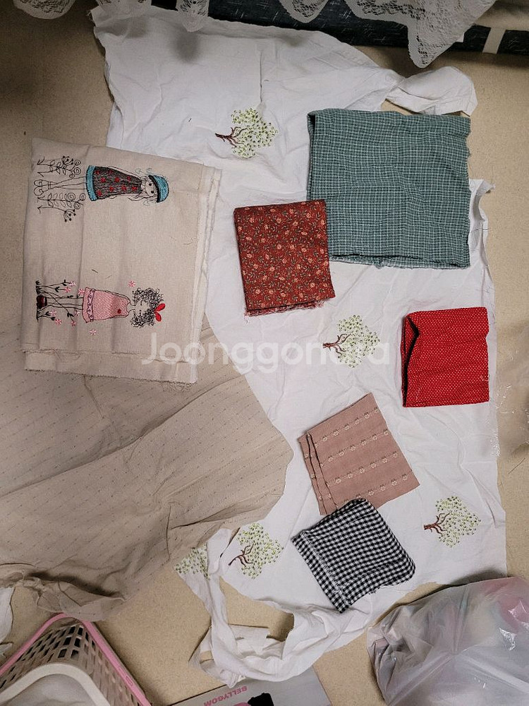 아기자기한 캐릭터 자수가 그려진 베이지색 원단들이에요. 다양한 패턴과 색상으로 구성되어 있어서 여러 작품 만들기에 좋을 것 같아요. 사용감은 없고 상태 양호합니다. 직거래는 일요일만 되구요~ 평일은 출근땜에 문고리만 가능합니다~