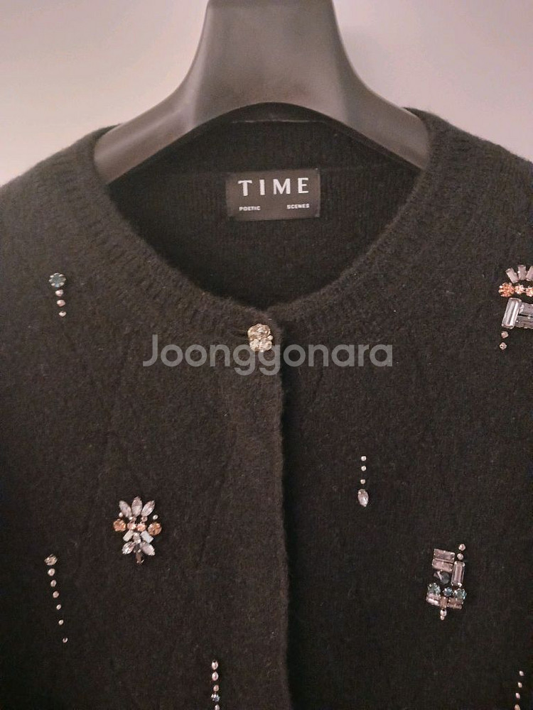 타임 블랙 보석 가디건. 엄청 고가 였어요.대략80- 90만정도.. 중고로도 거의 안나와요....블랙색상. 프리싸이즈 한눈에 반해 구매했어요. 도톰한소재에 모헤어 느낌도 약간 있어요. 첫단추 보석은 목걸이 처럼보여요. 단추도 속단추로 깔끔하고 고급스러워요 . 상태는 1-2번 집에서 시착한 정도입니다. 그래도 약간의 마찰로 보풀이 있을수있어요.