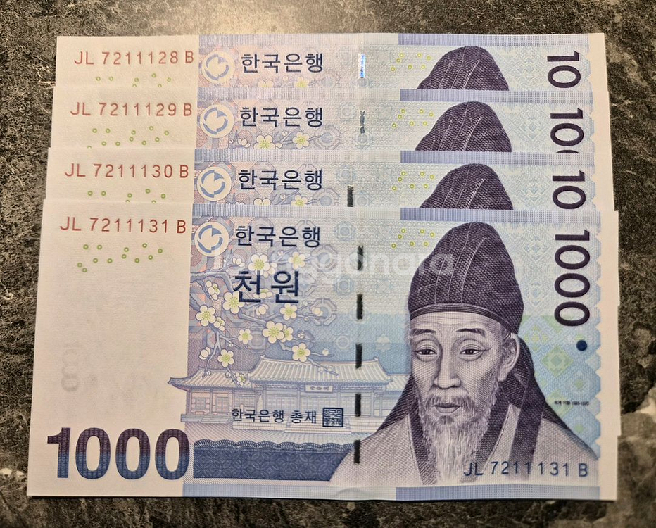 JH 7211128B 한국은행 천원권 지폐 4장 판매합니다. 상태는 사진과 같이 좋습니다. 수집용으로 보관하던 지폐입니다. 문의 없으시면 바로 안전결제해주시면 됩니다!