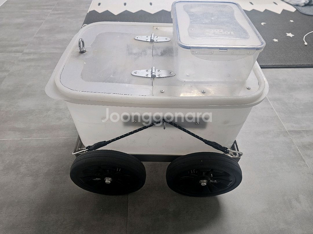 원래 일체형이었는데 분리형으로 개조 했습니다. 사이즈는 가로 43cm, 세로 46cm, 높이 45cm 정도 됩니다 ( 휴대폰 보관 케이스 포함) 바퀴 8인치 (20cm) 적용 바퀴부와 통 결속부분 보강 완료 전체 서스부분 아연코팅(녹방지) 완료 일체형 > 분리형 만들면서 통 안쓰는 구멍 부분은 에폭시접착제로 마감하여 누수 없습니다 (필요시 통만 교체하셔도 됩니다) 사실분만 연락주세요