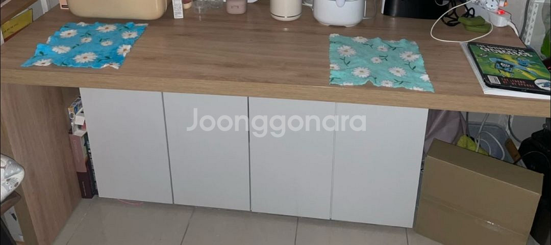 아일랜드 식탁 팝니다. 이사로 인해 급매하는거라 예민하신분은 피해주시고, 쿨거래 원합니다. 2023년 구매(30만원) 후 현재까지 큰 문제없이 사용했고, 3,4번째 사진에서 보면 하부 수납장과 다리역할 상판에 나사는 없습니다. 하부 수납장 위에 위 상판 올려놓고 쓰는거라 사용하는데 전혀 지장 없습니다. 하부수납장 무게로 2명이서 운반하는게 좋으실것 같습니다. 예약하시면 주소 알려드릴게요 감사합니다~~