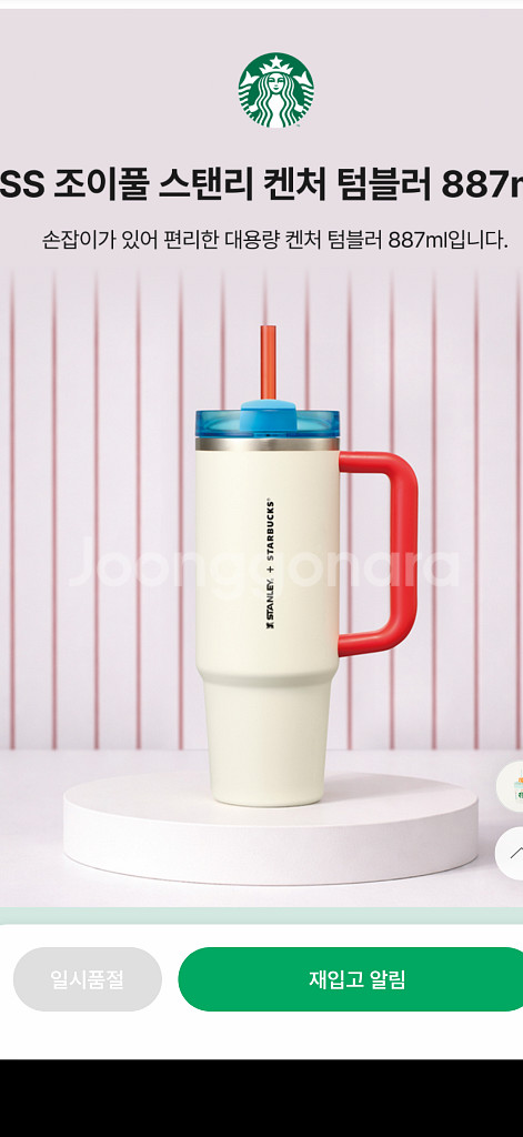 스타벅스 SS 조이풀 스탠리 켄처 텀블러 887ml 미개봉 새상품입니다 손잡이가 있어 편리한 대용량 켄처 텀블러로, 스테인리스 스틸 재질이라 보온/보냉 효과가 뛰어납니다.