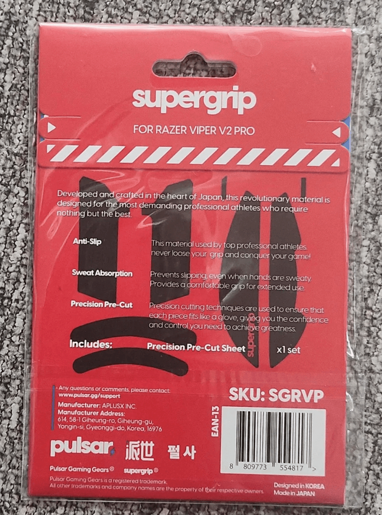 Pulsar Supergrip 레이저 바이퍼 V2 Pro용 그립입니다. - 미개봉 새제품 - 미끄럼 방지 및 땀 흡수 기능으로 게임 시 안정적인 그립감을 제공합니다 - 정교하게 재단되어 마우스에 완벽하게 맞습니다 - 정밀 재단 시트 1세트 포함되어 있습니다 - 한국에서 디자인되었고 일본에서 제조되었습니다