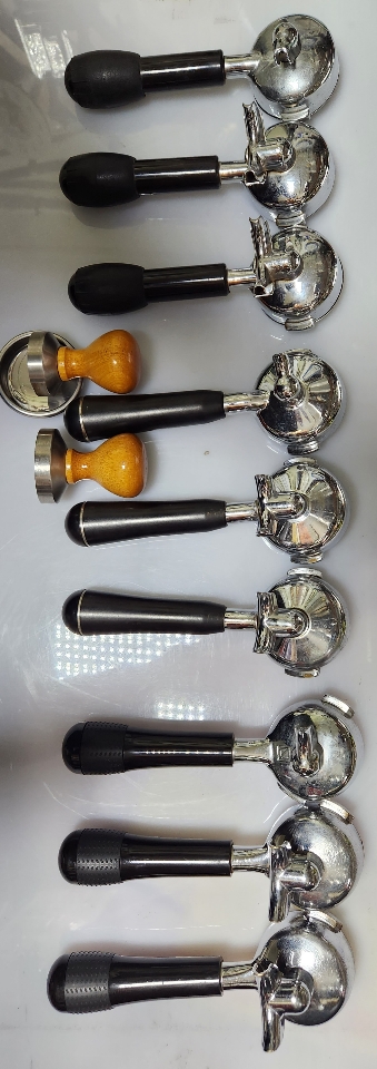La CimBali 제품 포터 필터 9개 템퍼 2개 가격. 협의 전화 주세요 olo 四六九八 三五三六 전문가용 에스프레소 포터필터 여러 개와 탬퍼가 포함된 세트예요. 스테인리스 스틸 소재로 고급스럽고 상태도 양호합니다. 카페나 홈카페용으로 완벽한 구성이에요!