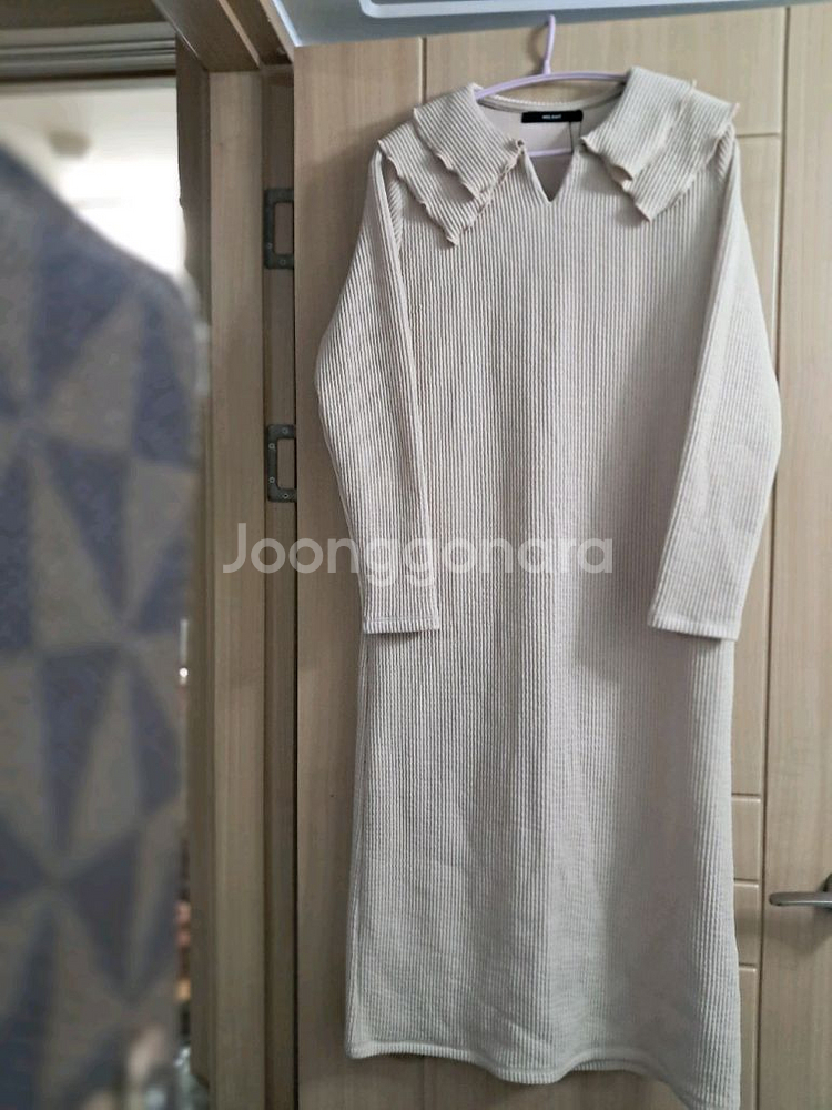 베이지 컬러 니트 원피스예요. 목 부분에 리본 디테일이 있어서 여성스럽고 예쁜 느낌이 나네요. 상태 양호하고 깔끔하게 관리된 제품입니다.