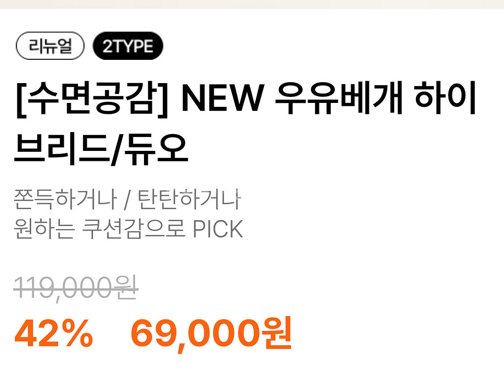 수면공감 우유베개 하이브리드 1월 구매, 4-5일 사용 후 저에게는 안 맞아서 새상품 그대로 보관중입니다. 택도 그대로 있어요. 저는 체구가 작아서 높다고 느껴지는데 보통 체형의 분들은 잘 맞을 것 같아요. 69,000원에 구매했어요. 저렴하게 올려봅니다.