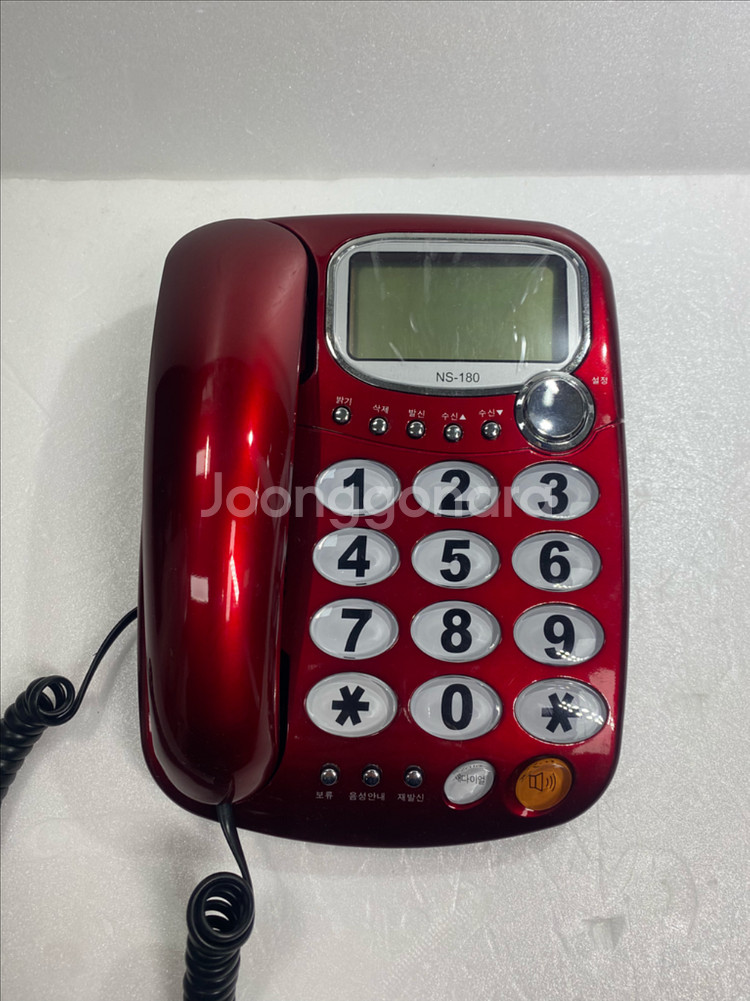 레드 컬러의 유선전화기예요. LCD 화면과 숫자 버튼이 선명하게 잘 보이고, 다이얼 음성안내기능이 있어서 시각장애인에 유용합니다