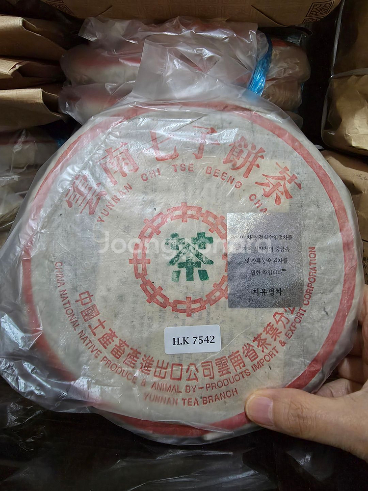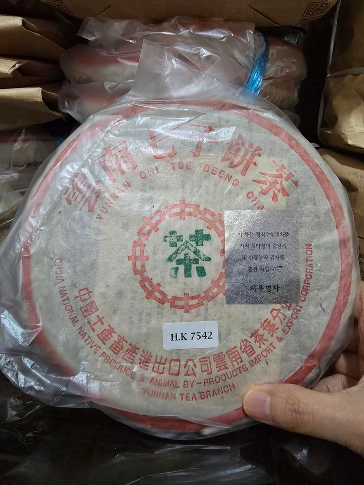 HK 7542 맹해차창 중국 운남성 보이차 칠자병차 입니다. 서울 지유명차에서 구매했습니다. 90년대 말 생차입니다. 010-3277-이사구일 문자 부탁드립니다~