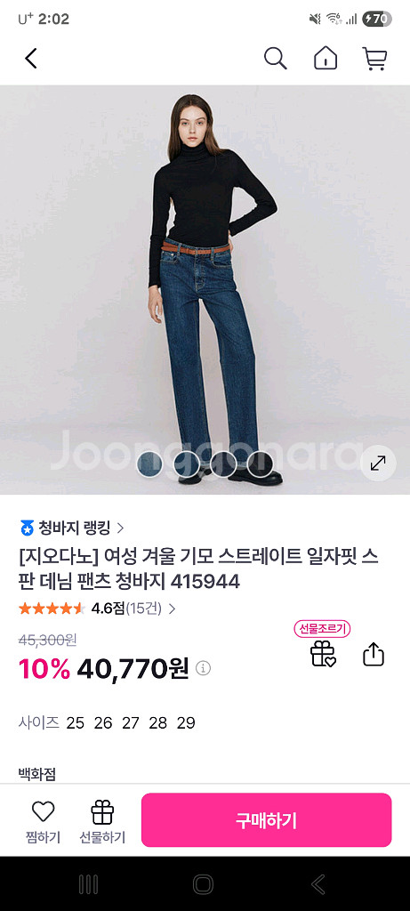 https://m.gsshop.com/prd/prd.gs?prdid=1098113856 사이즈 26 워시드 미디움블루 안쪽 두터운기모아니구요 안쪽이 부드러운? 데님이에요 2주전 롯대백화점에서 구매했어요 조금 작아서..