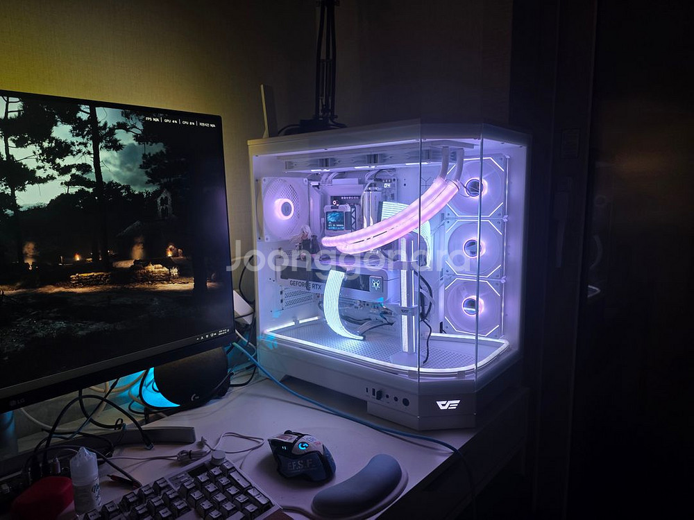 화이트 초고사양 게이밍 컴퓨터 입니다. 직접 조립했습니다. 메인보드부터 최상위만 사용했습니다. SSD제외 시 30만원 네고 가능. SSD : 삼성전자 980 PRO M.2 NVMe 2TB CPU : 인텔® 코어™ Ultra 9 프로세서 285K 그래픽카드 : MANLI 지포스 RTX 5080 Polar Fox OC D7 16GB (폴라폭스) 메인보드 : GIGABYTE Z890 AORUS ELITE WIFI7 ICE 쿨러 : Thermalright FROZEN WARFRAME 420 ARGB 서린 (3열 수랭) 램 : [G.SKILL] DDR5 PC5-48000 CL30 RIPJAWS M5 RGB 화이트 [64GB (32GB*2)] 파워 : [Segotep] GM1250W 80PLUS GOLD 풀모듈러 ATX 3.1 (PCIE5.1) 화이트 (ATX/1250W) 케이스 : [darkFlash] DQX90 ARGB 강화유리 [미들타워] [화이트] 팬 : 화이트 ARGB팬 4개 그외 : ARGB 다크플래쉬 그래픽카드 지지대, 수랭케이블 ARGB 커버 외 이사 예정이라 데스크테리어를 오크색상으로 해서 블랙 ITX 로 재조립하려고 내어놓습니다. 현존 하이엔드 성능이라 생각됩니다. 화이트 컴퓨터로 각종 액세서리등 정말 이쁘게 세팅한 컴퓨터 입니다. 수원입니다.