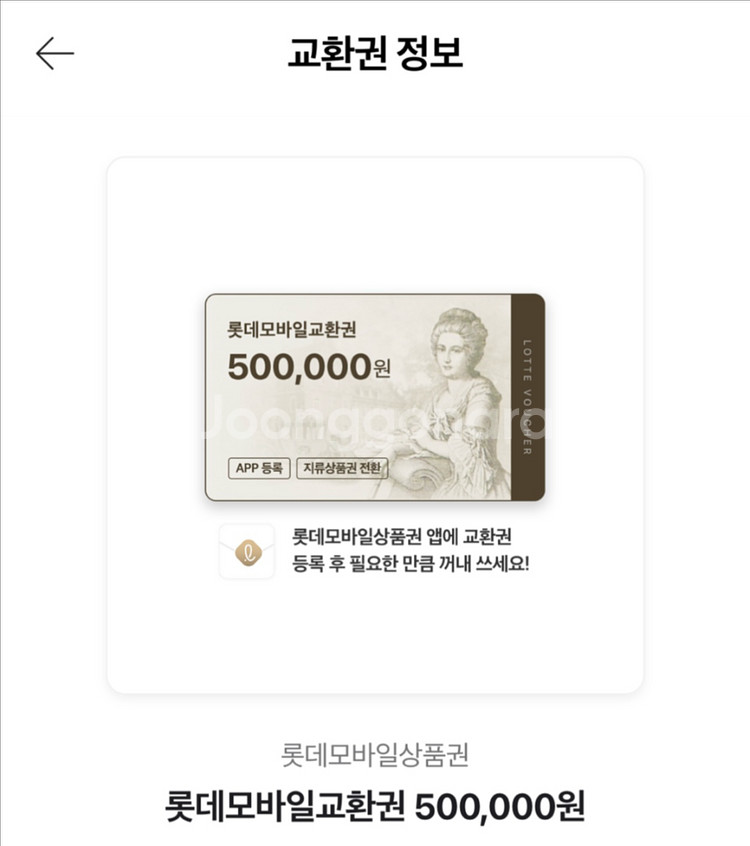 롯데모바일상품권 50만원권 입니다 교환권 이구요 바코드 보내드려요 48만원.