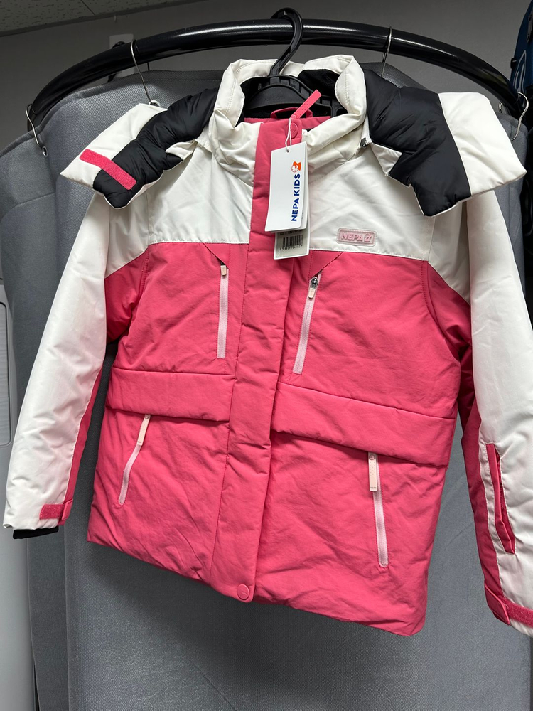 택 달린 네파 키즈 핑크/화이트 패딩 점퍼입니다. 사이즈는 130입니다.
