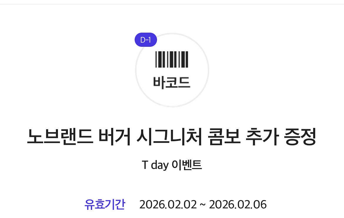 📌시그니처 세트 구매 시 시그니처 콤보 추가 증정 * 시그니처 콤보(정가 6,900원): 시그니처 버거+캔콜라 * 구매 상품(시그니처 세트)의 토핑/사이드/음료를 변경하시면 추가 금액이 발생할 수 있습니다. * 증정 상품(시그니처 콤보)은 다른 메뉴로 변경하거나 토핑 선택을 하실 수 없습니다. 단, 콜라는 직원에게 요청하면 같은 가격의 다른 탄산음료로 변경하실 수 있습니다.(매장 재고 상황에 따라 변경이 안 될 수 있습니다.) 📌이용 방법 쿠폰 사용 방법: 매장 직원에게 쿠폰 제시 또는 키오스크에서 사용 * 매장 영업 시간 안에 사용하실 수 있습니다. 매장 영업 시간: 오전 10시~오후 10시(영업 시간은 매장마다 다를 수 있습니다.) 키오스크 이용 방법: 키오스크 첫 화면 아래 통신사/제휴 쿠폰 선택 > 쿠폰 바코드 스캔 > 버거 토핑 선택 > 사이드 선택 > 음료 선택 > 증정 상품 선택 > '결제하기' 선택 > 결제 수단 선택 및 결제 📌유효기간: 2026.02.06. 입금확인 후 쿠폰 바로 보내드립니다!