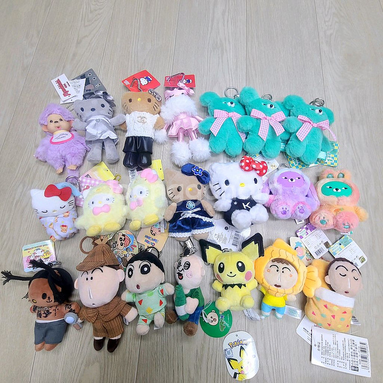 인형뽑기로 뽑은 키링인형들 판매합니다. 뽑아서 보관만 하고있는 택 달려있는 새상품인데, 뽑기인형 특성상 사진 잘보시구 예민하지 않으신 분들만 연락주세요. 판매후 교환❌️ 반품❌️ 롱다리키티, 피카츄, 짱구시리즈캐릭터, 몬치치, 산리오 병아리키티, 와사비베어 등등 총21개 개당 4천원입니다. 일괄 하시면 배송비 무료!!! 총 21개 45,000원!!! 문의 있으시면 편하게 연락주세요!!
