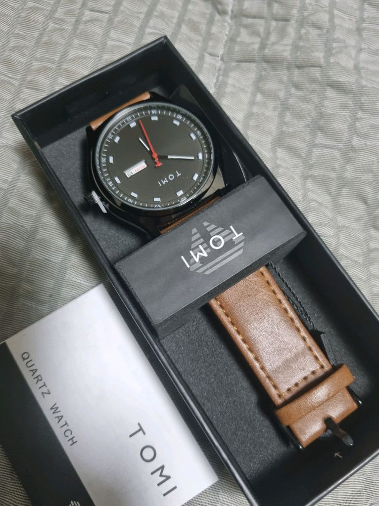 남성용 시계예요. 블랙 다이얼에 브라운 가죽 스트랩으로 깔끔하고 세련된 디자인이에요. 박스와 설명서 포함되어 있어 상태 좋습니다.