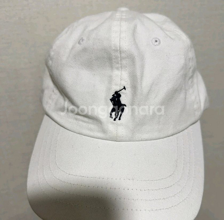 정품 화이트 볼캡이에요. 앞면에 브랜드 로고가 새겨져 있고 뒷면에는 브랜드명이 프린팅되어 있어요. 전체적으로 깔끔한 상태입니다.
