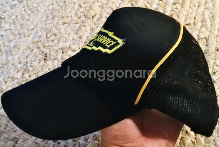 오일필드 서비스 로고가 새겨진 블랙 메쉬 캡이에요. 옐로우 파이핑과 포인트 디테일이 멋스럽고, 전체적으로 상태 양호합니다.