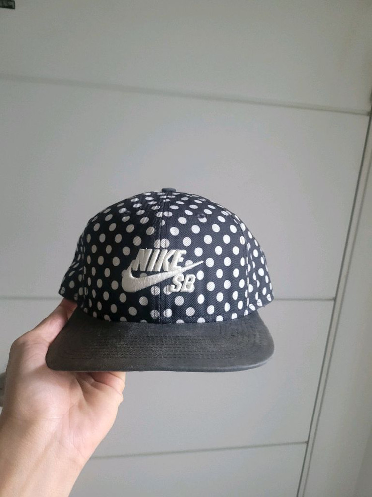 정품 도트 패턴 스케이트보드 모자예요. 네이비 바탕에 화이트 도트가 포인트로 들어가 있고, 앞면에 로고와 브랜드명이 새겨져 있어요. 전체적으로 깔끔한 상태입니다.