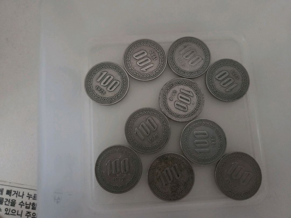 1973, 1974년 발행된 100원 동전들과 기타 년도 동전들이에요. 총 10개 정도로 보이며, 투명 케이스에 깔끔하게 보관되어 있어 상태가 양호해 보입니다.