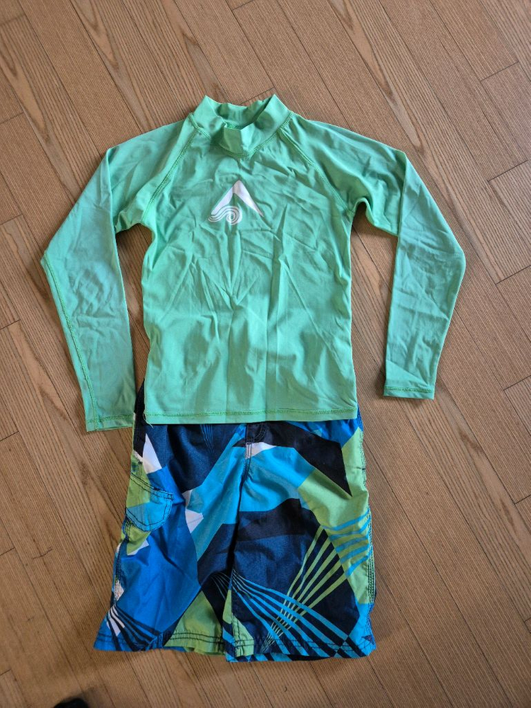 서핑전문키즈 수영복이라고해서 직구로 구매해 입었어요 상의는 10사이즈 가슴단면35 목부터팔길이59 목부터 총길이 54 하의는 8사이즈입니다 허리단면29 총길이46 얼룩없이 상태 깨끗해요 집정리중이라 반품에눌 안 받아요