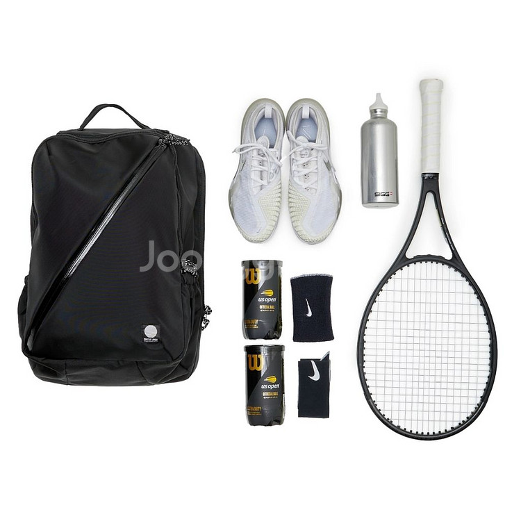 테니스 라켓과 운동화, 물병, 스트랩 등이 포함된 완전한 테니스 세트예요. 블랙 컬러의 실용적인 백팩으로 테니스 치기에 필요한 모든 용품을 한 번에 갖춘 구성입니다. 2회 사용