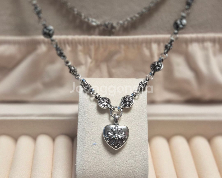 롱하진않은데 무게감있고 고급스런 느낌입니다. 하트 모양 참과 꽃 장식이 포인트로 들어가 더 예쁘고 힙해요. 실버라고 되있지만 실버는 아닙니다. 하지만 변색 적고 빈티지 컬러라 걱정안하셔도 되세요^^ 사이즈는 사진 참고해주세요^^