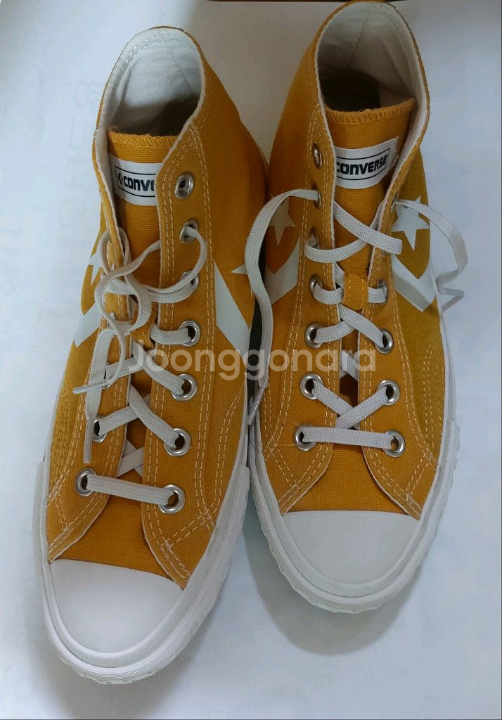 컨버스 하이탑 원스타 옐로우 230사이즈 거의 착용안해서 깨끗합니다 5회전후착용 때탐 닳음 없어요 노란색부분 바깥면이 스웨이드소재 끈이 탄성있는 고무줄끈으로 교체되어있어요