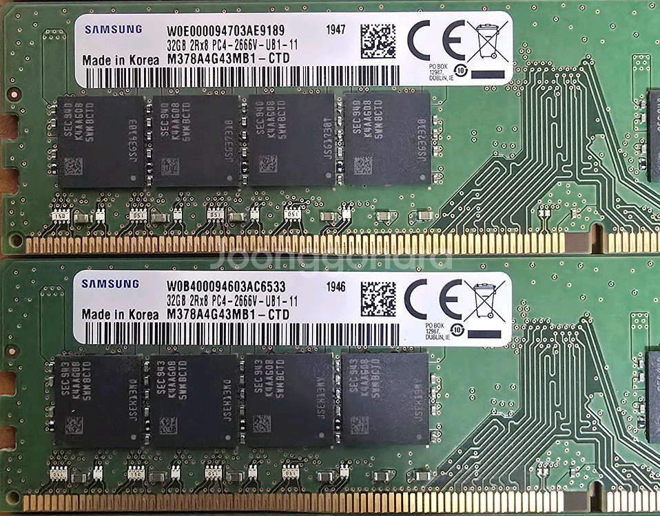 DDR4 32GB 메모리 2개입니다. 정품으로 상태 양호하며, 컴퓨터 업그레이드용으로 좋아요. 개당 가격이며, 2개일괄 구매시 52만원 거래가능합니다.