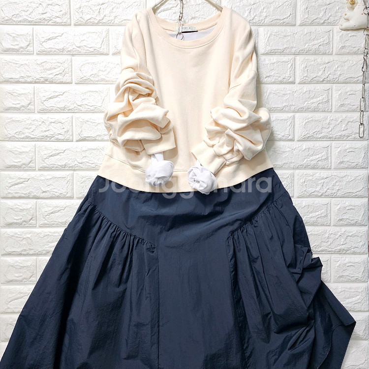 프리사이즈입니다 (77언냐들. 가능해요) 아이보리 색상의 상의(면)와 네이비 색상의 하의(폴리)가 붙어있는 넉넉한품에 롱원피스입니다. 치마부분셔링 디테일이 귀여워요 편하게 입기 좋아요 상태양호합니다 가슴반품 54 길이. 124 반품환불 안대요 신중구매주세요