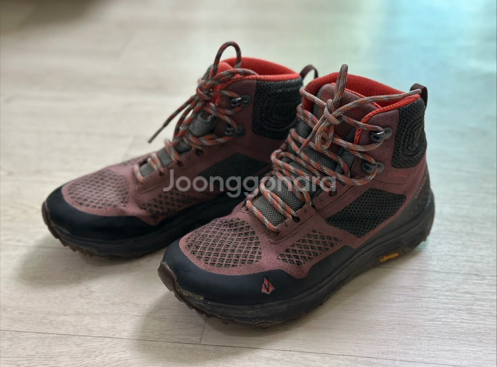 잘빠진 바스큐 여성 등산화입니다 - 정가: 약 25만원 - 사이즈는 235mm - Vibram 밑창으로 접지력이 우수 - 고어텍스 소재로 방수 기능이 뛰어남 전반적으로 사용감은 있지만, 기능적인 하자는 없습니다