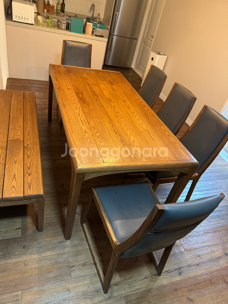 원목(장미목) 6인용 식탁 세트 판매합니다. 의자 4개와 벤치 1개로 구성되어 있습니다. 과거 약 380만원에 구매하여 사용감있으나 전체적으로 깨끗하게 사용했으며, 원목의 자연스러운 나뭇결이 살아있어 따뜻한 분위기를 연출합니다. 견고한 디자인으로 안정적인 사용이 가능하며, 넉넉한 사이즈로 가족 식사나 손님 맞이에도 좋습니다. - 가로 180cm 세로 90cm 이사날 2/25일 거래가능하며 사다리차로 1층에 내려드릴수있습니다. 위치: (노들역 근처) 본동신동아 아파트