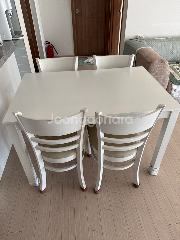 깔끔한 화이트 컬러의 4인용 식탁과 베이지색 쿠션 의자 4개로 구성된 세트예요. 사용감은 있지만 전체적으로 깨끗한 상태입니다. 실용적이고 모던한 디자인으로 어떤 인테리어에도 잘 어울려요.