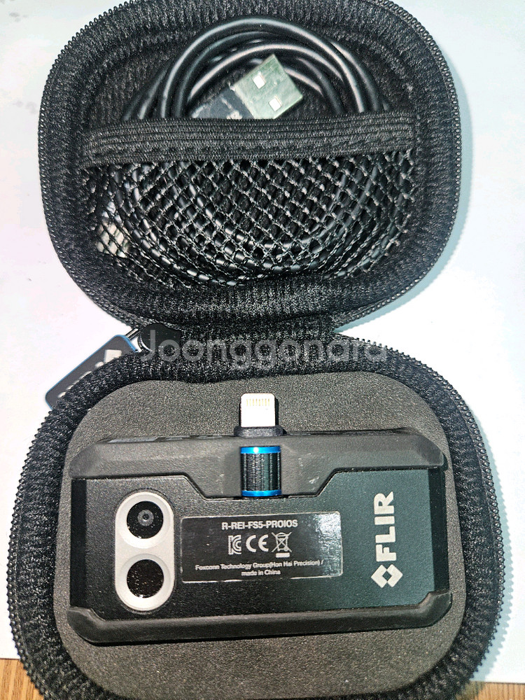 플리어원프로 라이트닝케이블단자 휴대용 열화상 카메라입니다. 전용 케이스와 충전 케이블이 포함되어 있어요. 상태 양호하고 정상 작동합니다.