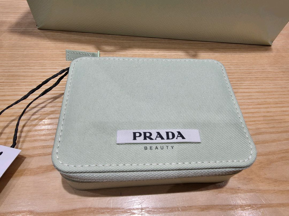 프라다 뷰티 케이스 민트색 새상품입니다 립밤이나 작은 화장품 보관용으로 좋을 것 같아요 가로 11.5 세로 8.5 높이3.5 정도