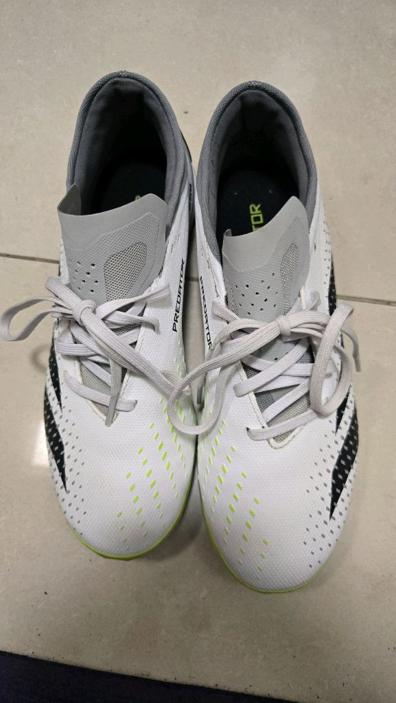 아디다스 프레데터 엘리트 폴드오버 텅 AG 축구화 265mm 판매합니다 화이트, 블랙, 형광색 조합으로 깔끔하면서도 눈에 띄는 디자인입니다 23년 5월에 제조된 제품으로,사놓고 두번쓰고 창고에 있었습니다. 보시다시피 먼지같은게 거의없는 새상품과다름없는 S급입니다 구매할때 28만원 정도 주고사서 8만원정도에 판매합니다