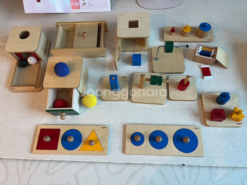 아이들 감각 발달과 소근육 발달에 좋은 몬테소리 교구들이에요. 원목 재질로 만들어져 안전하고 다양한 놀이가 가능해서 추천해요. 사용감은 있지만 전체적으로 깨끗한 상태입니다. 23년 여름경 아가월드 정품으로 구매하여 딸 1명이 수업에서 사용하였습니다 아이가 돌 지난 이후에 구매한 것이라 물고 빨거나 하지 않고 깨끗하게 사용하였습니다 원목 재질로 어린 시절부터 몬테소리 환경 구성에 사용하시면 좋을 것 같아요 필요하시면 구성에 포함되지 않은 색깔원기둥, 별도로 구매한 꼭지원기둥, 몬테소리육아대백과, 나사돌리기(4개), 한국몬테소리 계란공 등 드려요 저희 아이는 교구를 접해서 그런지 젓가락 사용, 연필 쥐고 그리기 잘하고 있습니다 집에서 별도 수업 없이도 활용할 수 있도록 키즈에이원 시크릿북 해당 교구 부분 사진촬영해서 드릴 수 있어요