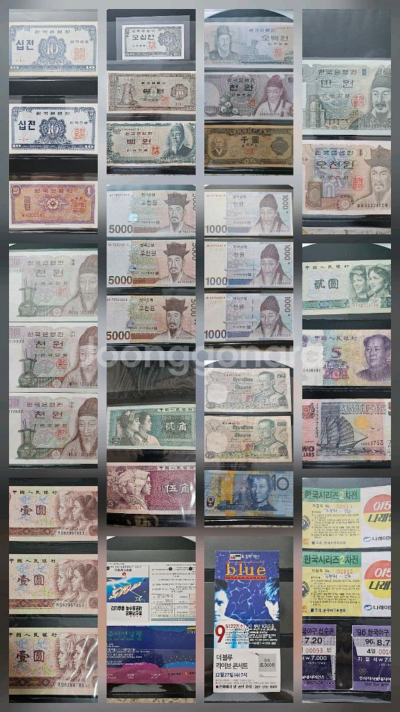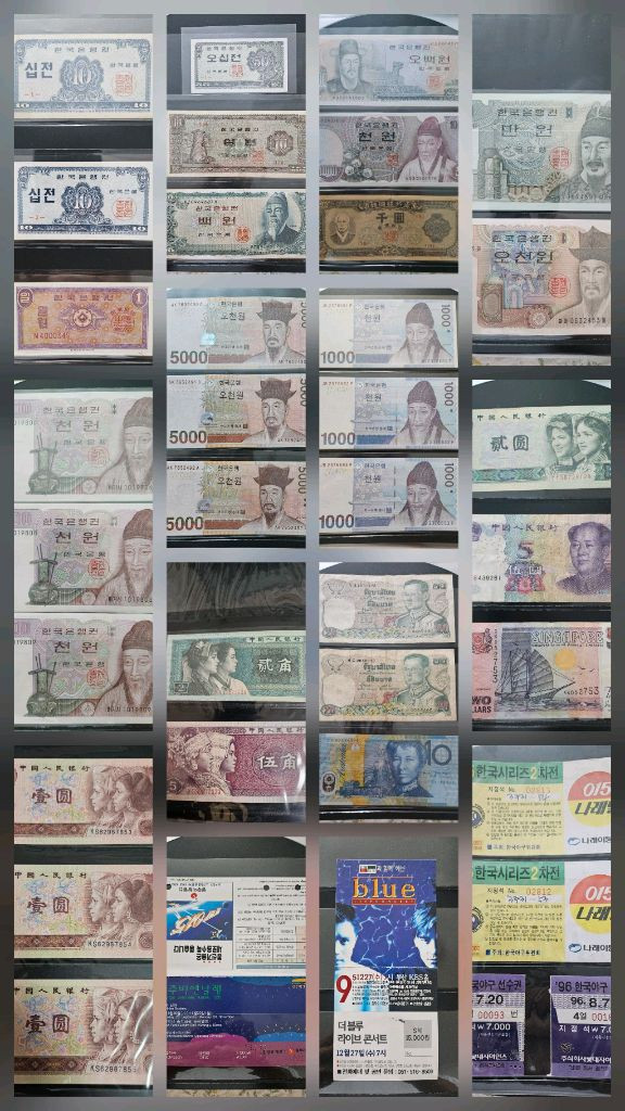 우리나라 옛날돈 지폐 십전 2장 (1962년) 일원 1장 (1950년대~1960년대) 오십전 1장 (1962년) 십원 1장 (1953년~1962년) 백원 1장 (1962년 이후) 오백원 1장 (1973년~1993년) 천원 1장 (1975년~1993년) 천환 1장 (1950년대~1960년대) 구권 만원 1장 (1983년~1999년) 구권 오천원 1장 (1983년~2005년) 구권 천원 18장 (1983년~2006년) 신권 오천원 5장 (2006년~현재) 신권 천원 17장 (2007년~현재) 외국돈 지폐 중국 1위안 5장 (1990년대) 중국 2각(0.2위안) 4장 (1980년대) 중국 5각(0.5위안) 1장 (1980년대) 중국 2위안 1장 (1990년대) 중국 5위안 1장 (2005년) 싱가포르 2달러 1장 (1984년~1999년) 태국 20바트 2장 (1969년~1980년) 호주 20달러 1장 세계 최초의 폴리머(플라스틱) 지폐 입장권 1995년 광주비엔날레 어른 1장, 어린이 1장 1995년 손지창, 김민종 더블루 부산 KBS홀 콘서트 1995년~1996년 프로야구티켓 23장 1995년 플레이오프 티켓 3장 1995년 한국시리즈 티켓 2장 일괄 판매 합니다