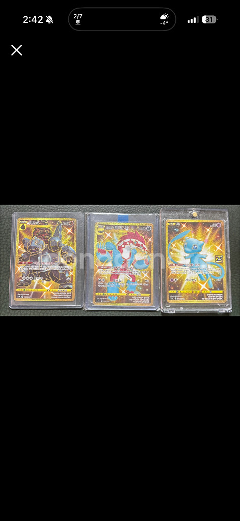 개인정보(거래정보)를 주고받는 행위는 사기에 노출될 수 있으므로 즉시 중고나라로 신고해 주세요포켓몬 카드 뮤 이로치(25주년)-8만원 석탄산 이로치-2만원 가라르 가로막구리 이로치-1만원 일괄 20만원 상태좋고 얼룩 구겨짐 찢어짐 등 모두 없음 슬리브+플라스틱틀에 보관중 택거가능