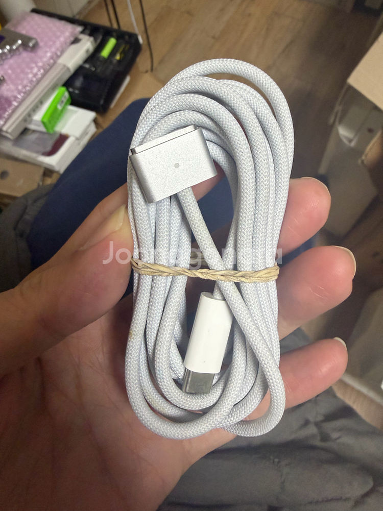 정품 맥세이프 케이블로 5핀 구멍이 있는 실버 컬러입니다. 사용감은 있지만 기능상 문제없이 잘 작동해요.