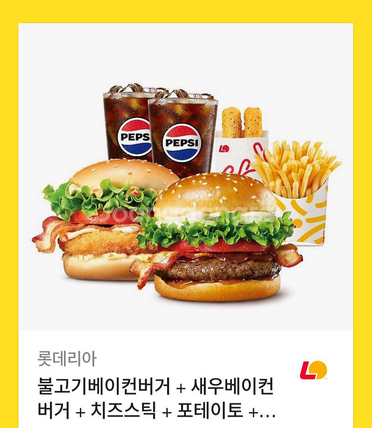 불고기베이컨버거 + 새우베이컨버거 + 치즈스틱 + 포테이토 + 콜라 2잔 (정가 16,900원) 26/3/1 까지 입니다 채팅주세요!