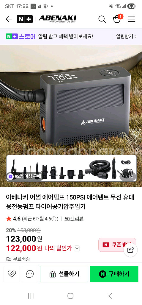 아베나키 어썸 에어펌프 150PSI 판매합니다 무선 펌프라 좋아요 - 최대 압력 150 PSI - 무게는 1.22kg입니다 에어매트,에어텐트,튜브,자동차타이어 등등에 바람 넣는곳 모두 사용 상세 설명은 인터넷 참고해주세요.